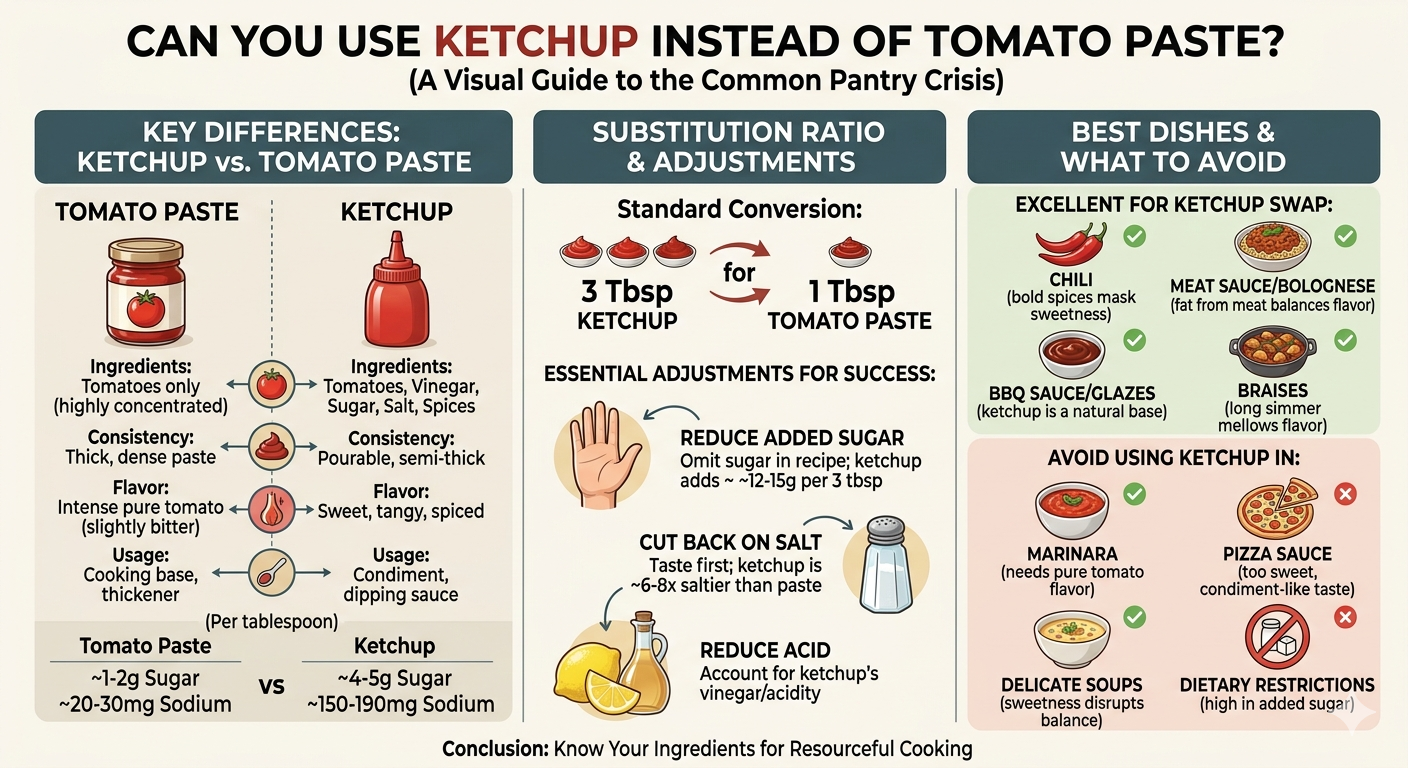 Štandardný náhradný pomer sú 3 polievkové lyžice kečupu na každú 1 polievkovú lyžicu paradajkového pretlaku — ale toto prichádza s dôležitými úpravami, pretože kečup je menej koncentrovaný, sladší a kyslejší.